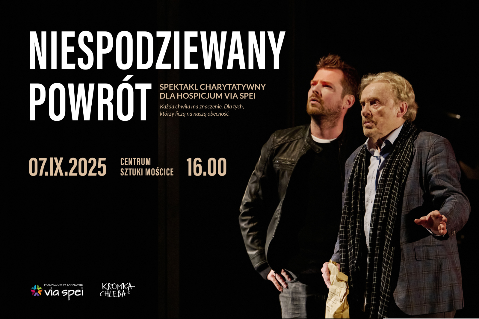 Centrum Sztuki Mościce Traugutta 1, Tarnów, małopolskie, PolskaSpektakl charytatywny dla hospicjum Via Spei „Niespodziewany powrót" to mądra sztuka z przesłaniem, która bawi, ale skłania do refleksji. Teatr dwóch aktorów – na scenie Daniel Olbrychski i Kamil Kula – to doskonała propozycja dla wymagającej widowni. W ,,Niespodziewanym powrocie" Daniel Olbrychski wciela się w postać aktora, który ma zagrać króla Leara. Szczególna trema i wielkie nadzieje związane z podjęciem tak dużego aktorskiego […]
