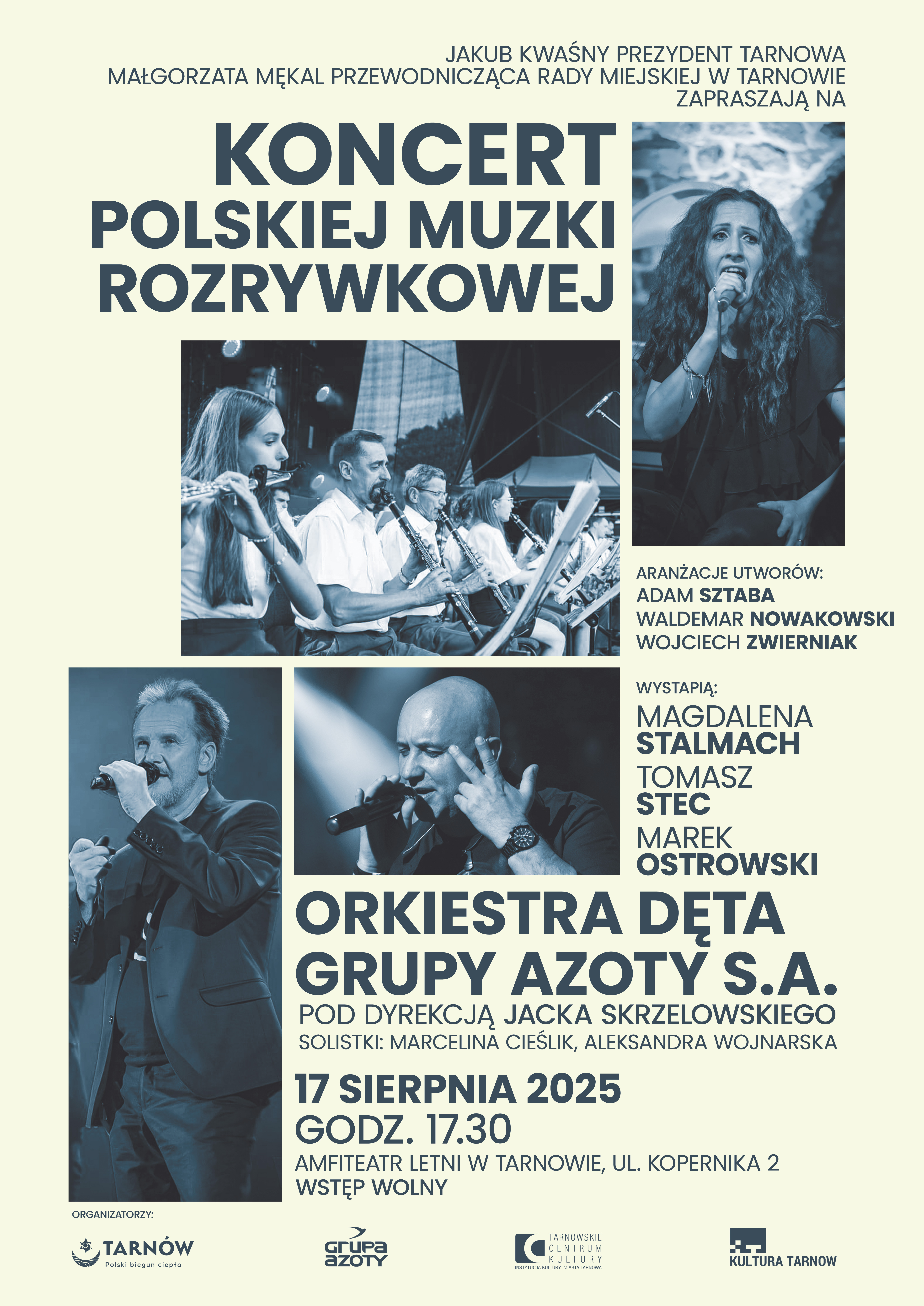 Amfiteatr Letni ul. Kopernika 4, Tarnów, małopolskie, Polska17 sierpnia 2025 roku o godz. 17:30 w tarnowskim Amfiteatrze Letnim zabrzmią największe przeboje polskiej muzyki rozrywkowej w wyjątkowych aranżacjach. Wszystko za sprawą koncertu Orkiestry Dętej Grupy Azoty, która przygotowała dla publiczności niezapomniany muzyczny wieczór. W repertuarze znajdą się utwory legend polskiej sceny muzycznej – Zbigniewa Wodeckiego, zespołów KULT i DŻEM, Krystyny Prońko oraz Anny […]