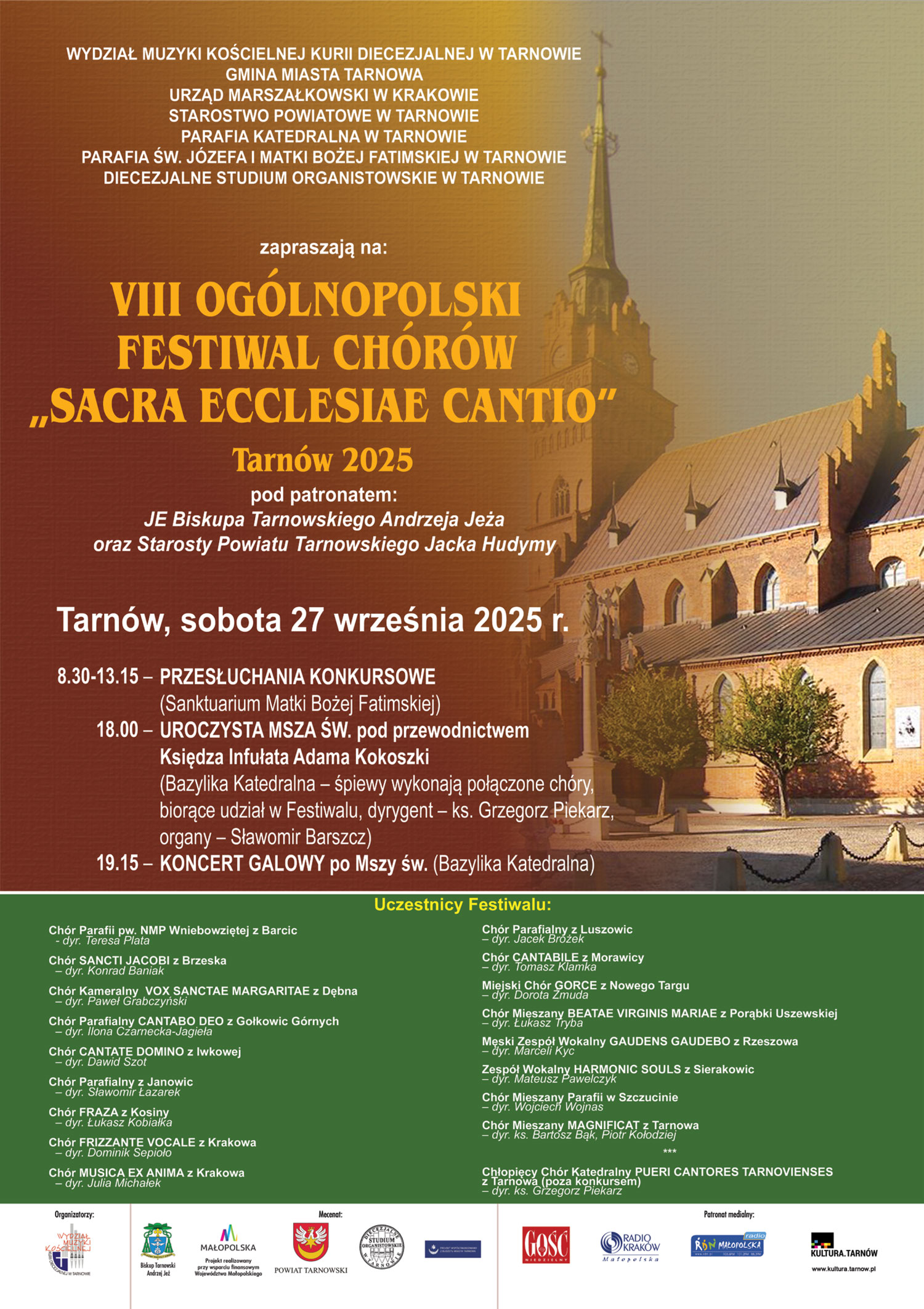 Bazylika Katedralna w Tarnowie ul. Kapitulna 2, Tarnów, małopolskie, PolskaSerdecznie zapraszamy na VIII Ogólnopolski Festiwal Muzyki Chóralnej „Sacra Ecclesiae Cantio – Tarnów 2025” Festiwal odbędzie się 27 września 2025 r. w Tarnowie. Obok konkursowych przesłuchań, które będą odbywać się w kościele Matki Bożej Fatimskiej w Tarnowie (od 8.30-13.30), punktem centralnym Festiwalu będzie uroczysta Msza św. w tarnowskiej katedrze (godz. 18.00) pod przewodnictwem Księdza Inf. […]