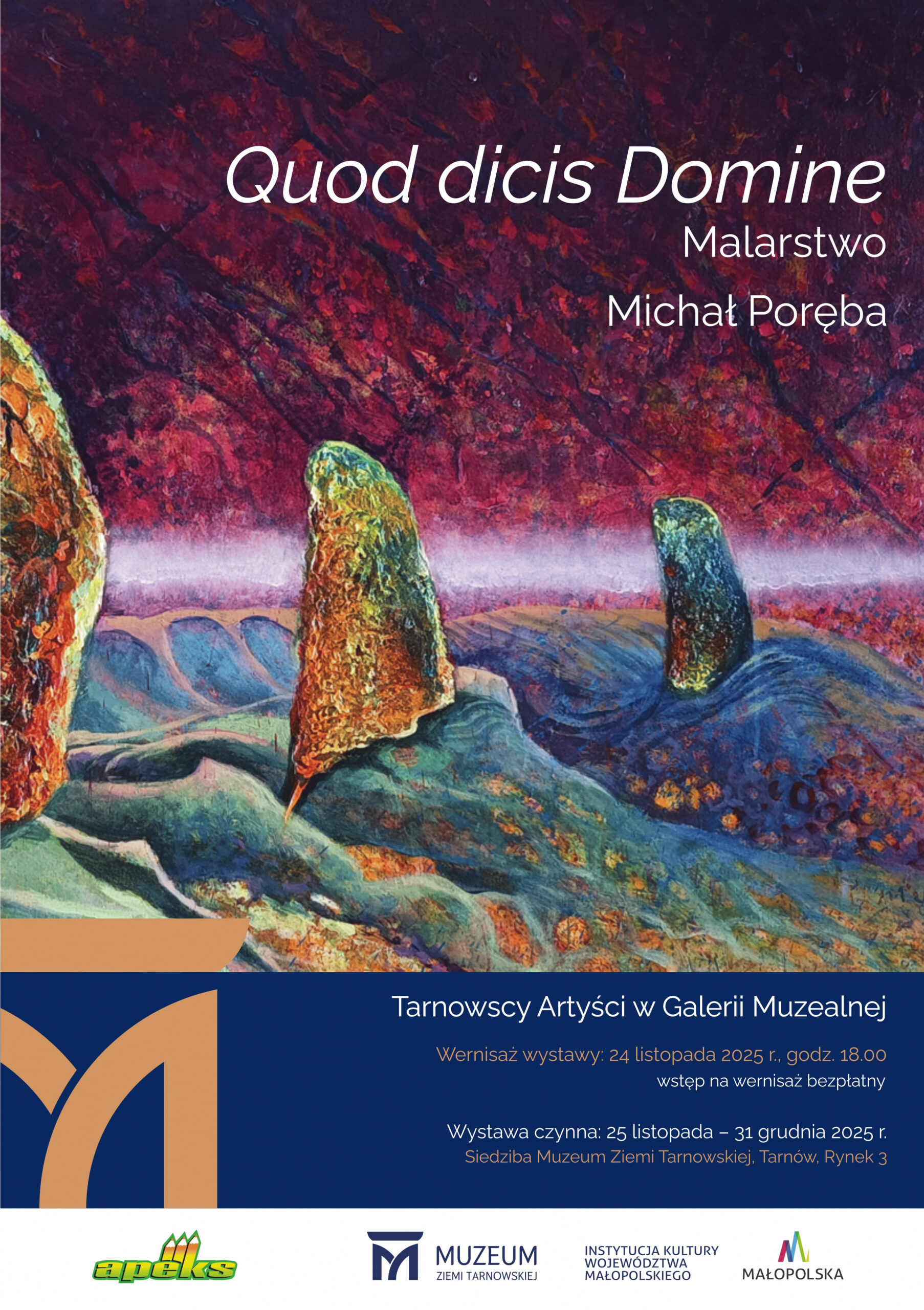 Abstrakcja, ekspresja, symbolika i bogata kolorystyka. Muzeum Ziemi Tarnowskiej zaprasza na wernisaż najnowszej wystawy Michała Poręby - jednego z najważniejszych i najbardziej rozpoznawalnych tarnowskich artystów, malarza, rzeźbiarza, pedagoga i twórcy działań parateatralnych. Wernisaż odbędzie się w poniedziałek 24 listopada 2025 roku o godz. 18:00 w siedzibie Muzeum przy Rynku 3. Wstęp na wydarzenie jest bezpłatny. Wystawę będzie można oglądać od 25 listopada do 31 grudnia 2025 roku.
