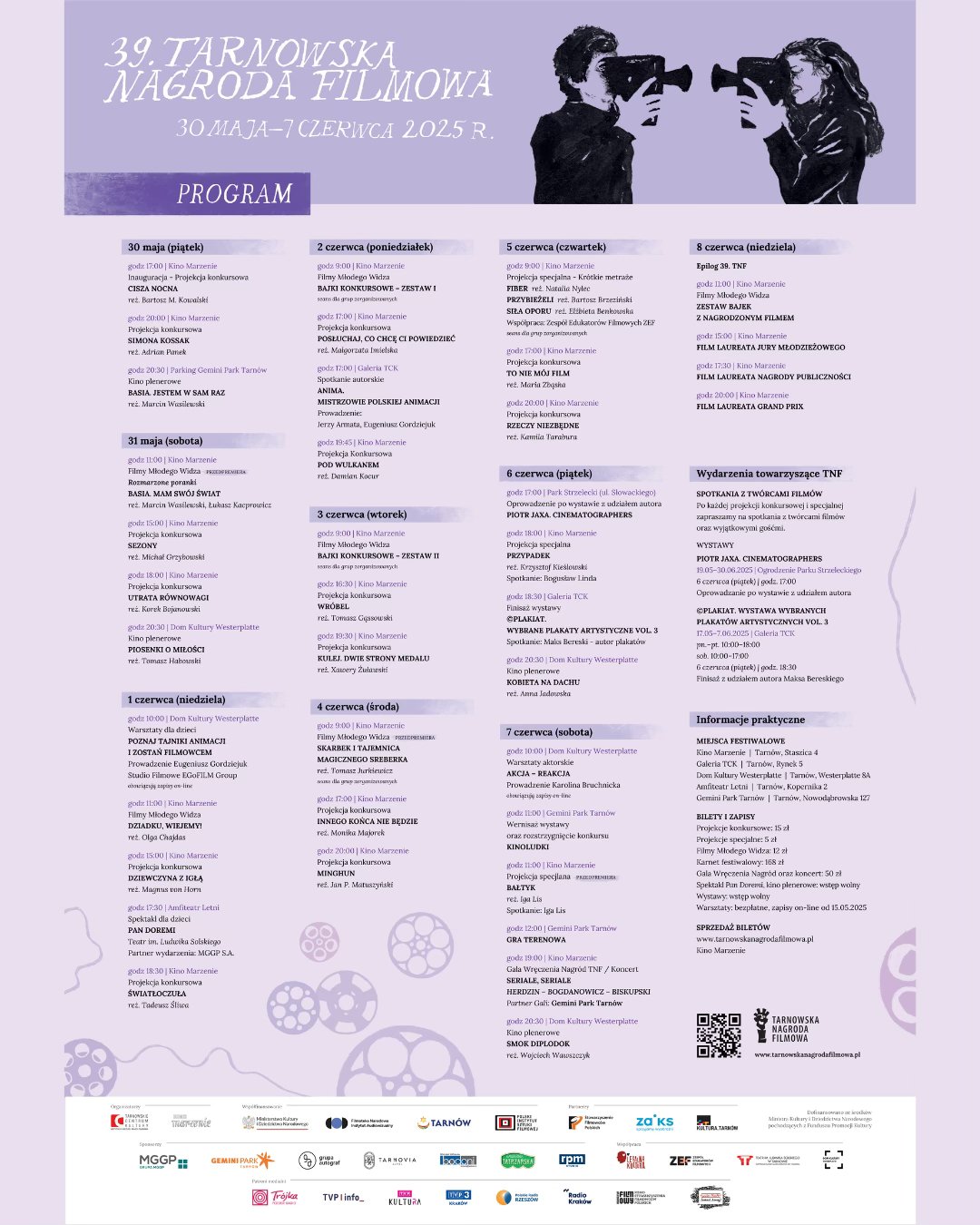 Organizatorzy niebawem odsłonią pierwsze programowe karty, tymczasem prezentują plakat artystyczny 39. Tarnowskiej Nagrody Filmowej. Autorem plakatu jest po raz trzeci © Plakiat – Maks Bereski, dwukrotny laureat Nagrody Polski Instytut Sztuki Filmowej w kategorii „Najlepszy plakat”.